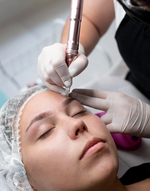 A microblading application duplicates natural hair structures to develop fuller eyebrows.